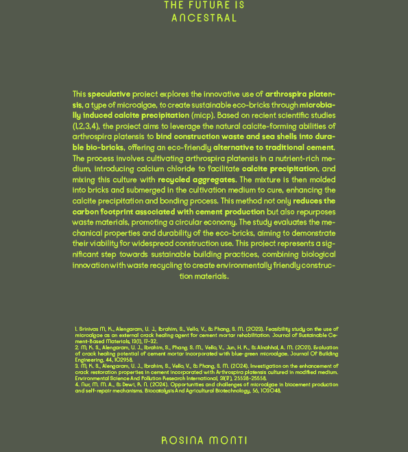 Durante el desarrollo de mi tesis final, "Eat, Digest & Grow", trabajé con procesos de biomineralización microbiana (MICP) para convertir residuos de construcción y residuos de conchas marinas en bio-ladrillos sostenibles, explorando tecnologías biológicas como el cultivo de microalgas (Arthrospira platensis) y el uso de agregados reciclados.